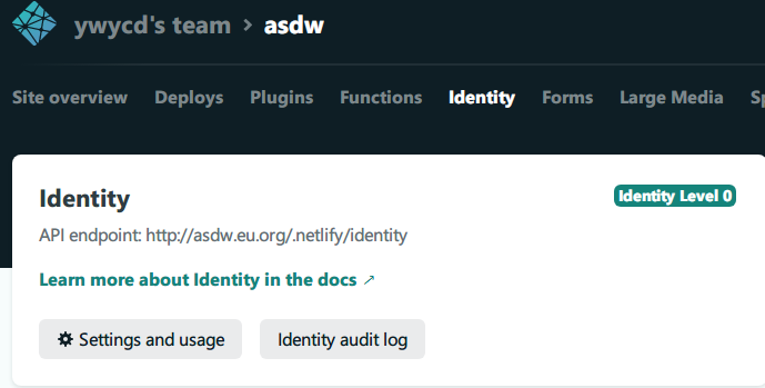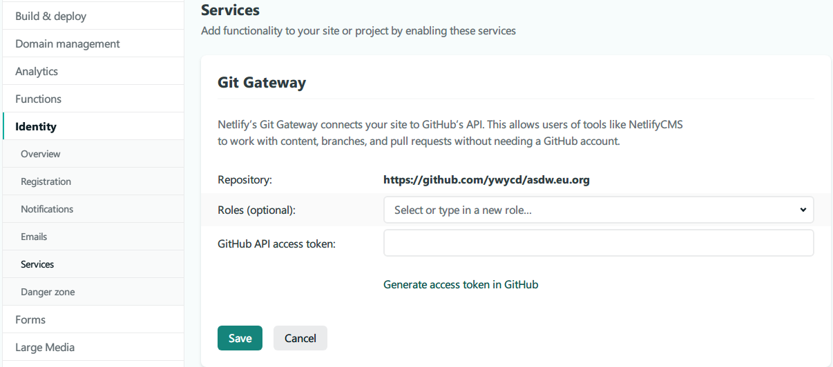 启用git-gateway 介绍,进netlify网页Site settings > Identity, 先enable Identity service。Identity > Services > Git Gateway, 选择Enable Git Gateway,同时生成token。